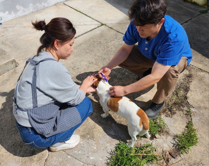 | ▲ 내장형 무선식별장치를 반려동물에 주입하고 있다(사진=진주시) |
