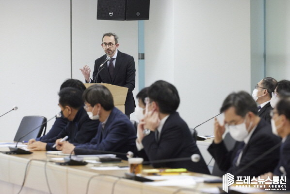 | ▲ 15일 오후 경기도청 4층 다목적회의실에서 열린 기회경기 혁신포럼 ‘경바시(경기도를 바꾸는 시간)’에서 클라우디오 바치안티 아고라 에네르기벤데 유럽지속가능금융 프로젝트 매니저가 탄소중립 및 에너지 전환 정책을 주제로 발표하고 있다.(사진=경기도) |