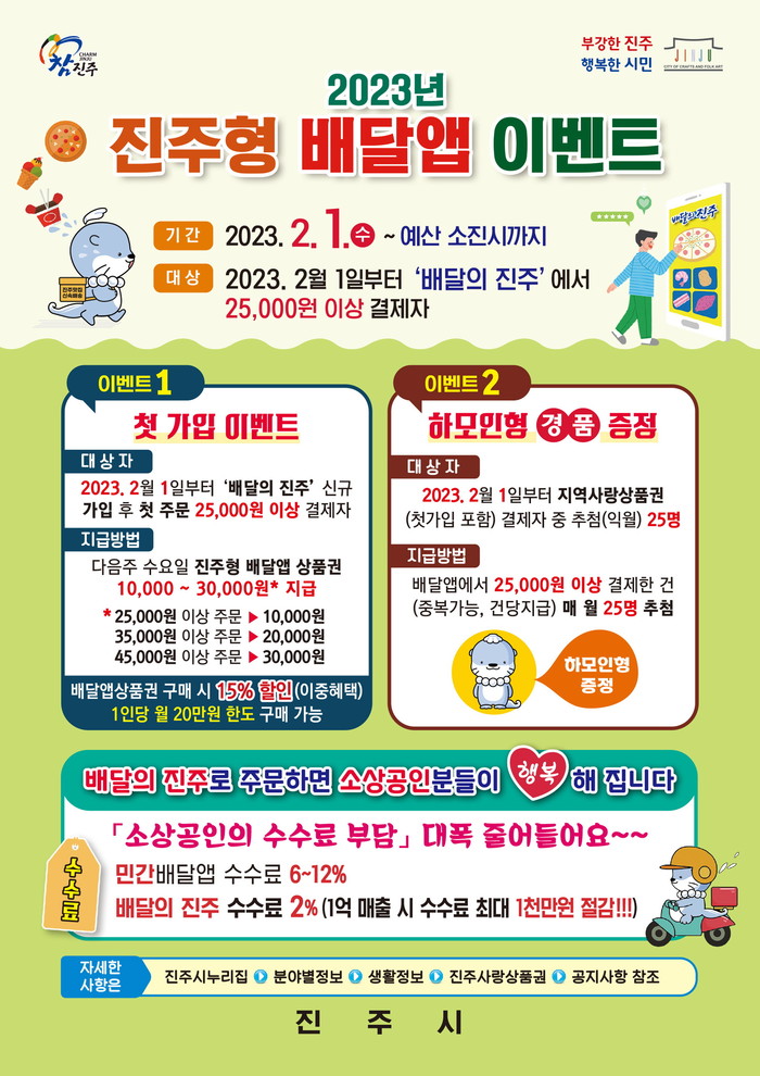 또한, 오는 2월 1일부터 예산 소진 시까지 진주형 배달앱 ‘배달의 진주’ 이벤트도 개최한다. 이번 이벤트 주요 내용은 ▲첫 가입 주문 시 2만 5000원 이상 주문한 이용자에게 ‘진주형 배달앱 상품권’ 1만 원 캐시백, 3만 5000원 이상은 2만 원 캐시백, 4만 5000원 이상 주문자에게는 3만 원 캐시백을 지급한다. ▲지역사랑상품권으로 2만 5000원 이상 결제자에게는 매달 25명을 추첨하여 다음 달에 2만 2000원 상당의 ‘하모인형’을 증정한다.