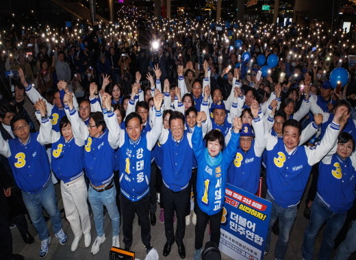 | ▲이재명 더불어민주당 대표와 강태웅 후보를 비롯한 참석자들이 9일 오후 서울 용산역 광장에서 열린 정권심판·국민승리 총력유세에서 퍼포먼스를 하고 있다.(사진= 뉴스1) |