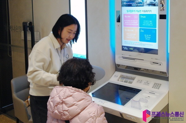 | ▲STM (Smart Teller Machine, 지능형 자동화 기기) 전담 매니저를 배치하여 중·장년층 손님의 기기 이용을 지원하고 있다.(사진=하나은행) |