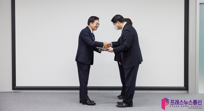 ▲ 김동연 경기도지사가 9일 오전 수원 경기도청 다목적회의실에서 30여 년간의 공직 생활을 마무리하고 명예 퇴임하는 이한규 경기도 행정2부지사에게 공로패를 전달하고 있다.(사진=경기도북부청) |
