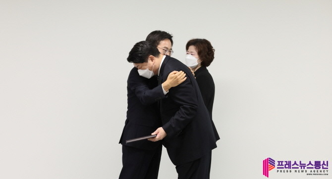 ▲ 김동연 경기도지사가 9일 오전 수원 경기도청 다목적회의실에서 30여 년간의 공직 생활을 마무리하고 명예 퇴임하는 이한규 경기도 행정2부지사와 포옹을 나누고 있다.(사진=경기도북부청) |