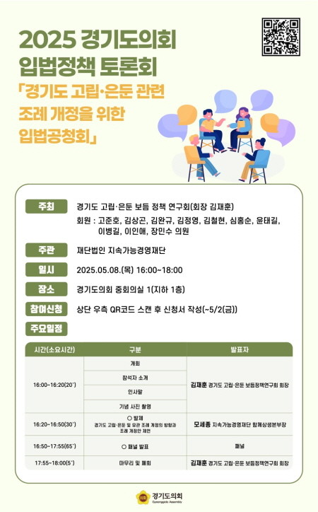 이날 공청회에서는 모세종 지속가능경영재단 센터장이 발제를 맡고 유현주 사회적협동조합 내비두 이사장, 박형규 경기대학교 교수가 토론자로 참여해 경기도의회 의원 및 경기도 관계 공무원들이 함께 실질적인 정책 개선 방안에 대해 의견을 나눌 예정이다.