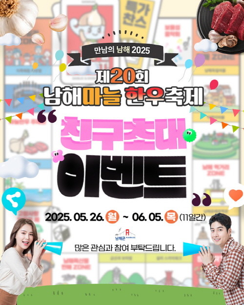 ‘친구야! 남해마늘한우축제 가자!’를 주제로 한 이번 이벤트는 국민 누구나 참여할 수 있으며, 축제 인지도 확산과 남해군 SNS 채널 소통 활성화를 위해 기획됐다.
