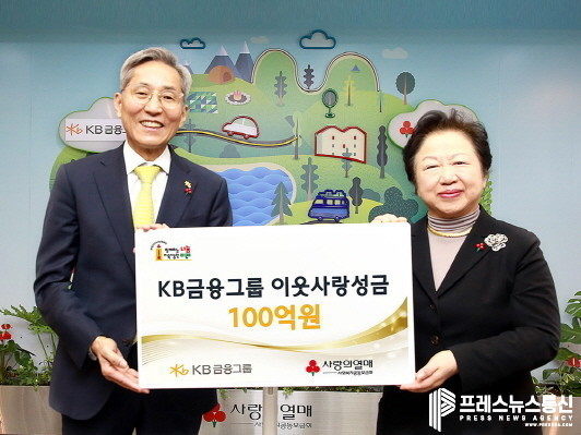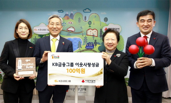 KB금융그룹(회장 윤종규)은 17일 서울시 중구 정동에 위치한 ‘사랑의열매 회관’에서 KB금융 윤종규 회장과 사랑의열매 이연배 부회장이 참석한 가운데 ‘희망 2023 나눔캠페인’에 기부하기 위해 사랑의열매 측에 이웃사랑 성금 100억원을 전달했다.