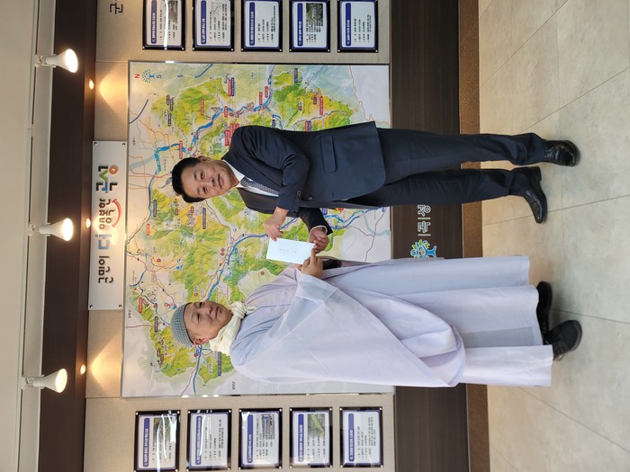 | ▲곡성군 천태암 주지 대주 스님, 복지기금 3백만 원 기탁 (사진제공=곡성군) |