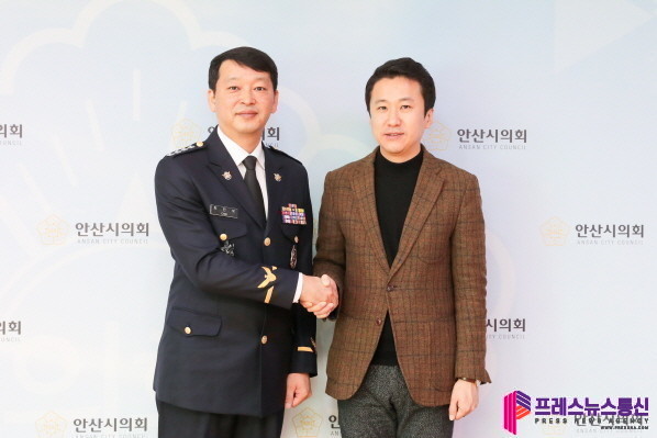 [프레스뉴스] 류현주 기자= 안산시의회 송바우나 의장이 16일 의장실에서 평택해양경찰서 최진모 서장을 접견했다.
