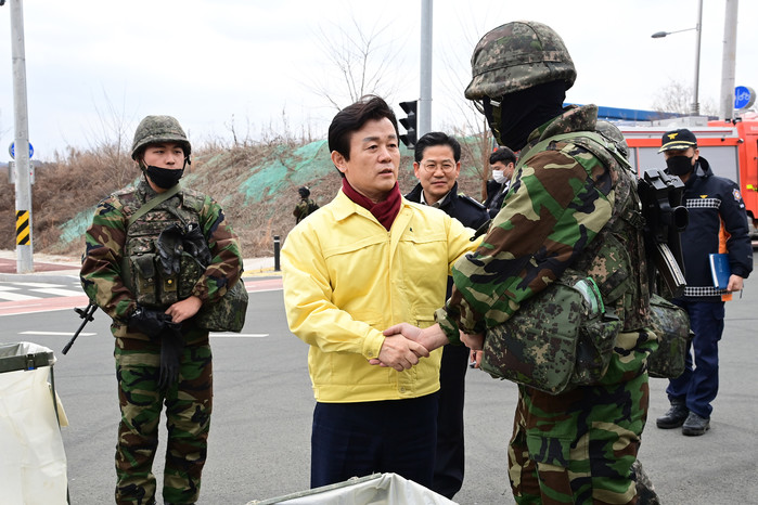 조규일 진주시장은 훈련 3일차인 15일 정촌 뿌리일반산단 앞 훈련지를 방문해 참관한 후 훈련 장병들과 참여자들의 노고를 치하했다.