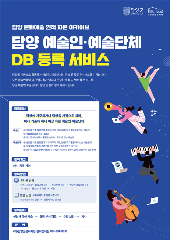 예술인·예술단체 DB 등록에 관한 자세한 사항은 담양군문화재단 홈페이지를 통해 확인할 수 있으며 (재)담양군문화재단 문화정책팀(☎061-381-8241)에 문의하면 된다.