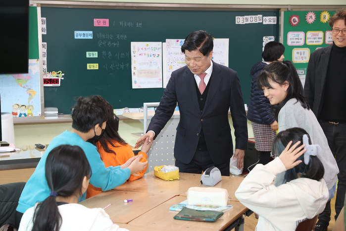 이상근 고성군수는 먼저 대흥초등학교 강정 교장과 만나 학교 운영의 애로사항을 청취하고, 교실과 학교 주변을 둘러보며 현황을 파악했다. 특히 6학년 학생들에게 직접 덕담과 함께 격려했다.
