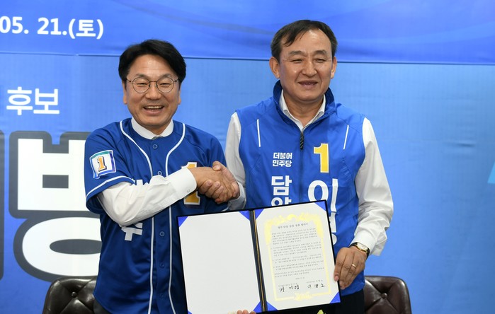 강기정 후보와 이병노 담양군수 후보는 21일 오전 10시 이병노 후보 선거사무소에서 상생정책협약식을 진행했다,