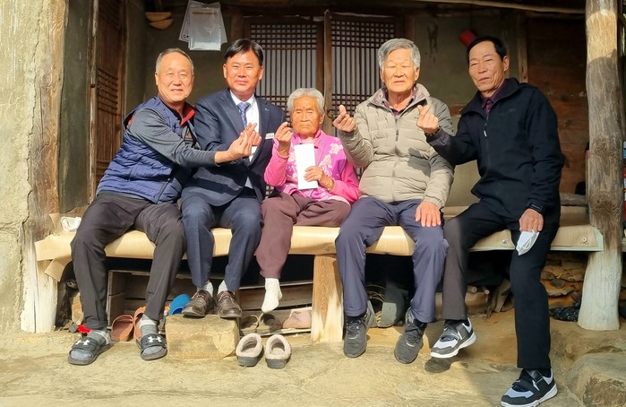 | ▲ 용주면 100세 어르신에게 장수축하금을 전달하고 기념촬영하고 있다.(사진=합천군) |