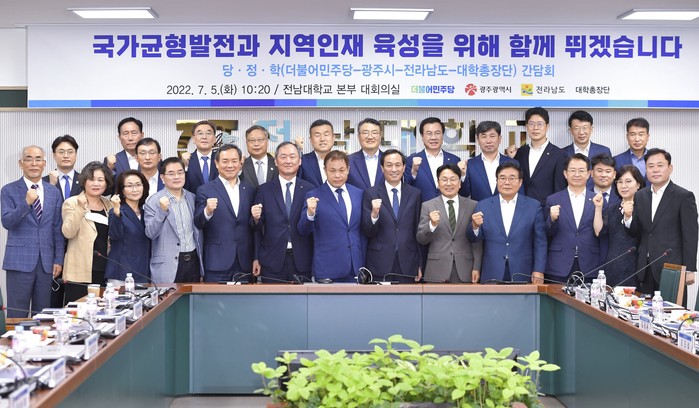 간담회에는 강기정 광주광역시장, 우상호 더불어민주당 비대위원장, 송갑석 더불어민주당 광주광역시당 위원장을 포함해 지역 국회의원 6명, 민영돈 광주전남대학총장협의회장, 조순계 광주전남전문대총장협의회장 등 광주·전남 지역 대학총장 14명, 황기연 전라남도 기획조정실장 등이 참석했다.