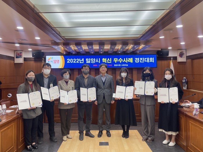 ▲ 밀양시청 소회의실에서 개최된 2022년 밀양시 혁신 우수사례 경진대회 시상식 후기념촬영을 하고 있다. (사진=밀양시) |