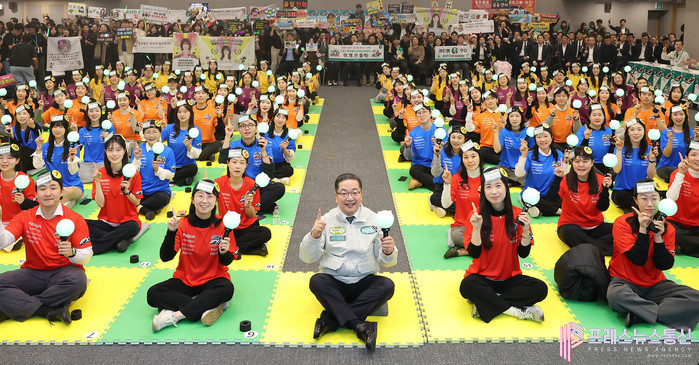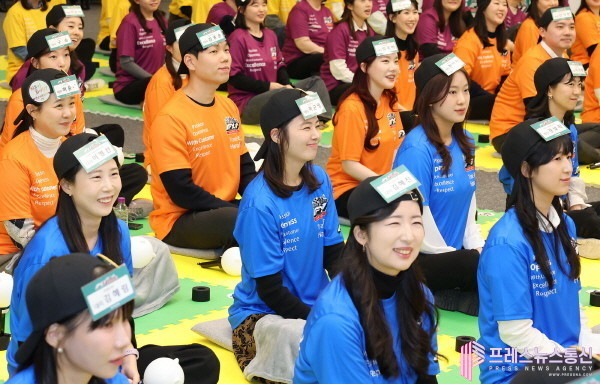 | ▲이호성 하나은행장(사진 가운데)이 대회에 참가한 직원들과 함께 응원 포즈를 취하고 있다.(사진=하나은행) |