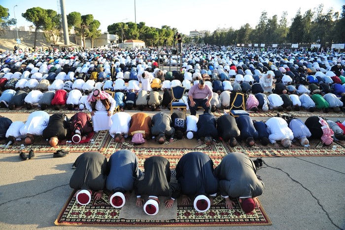 [프레스뉴스] 채정병 특파원=6일(현지시간) 이슬람 최대 명절 이드 알 아드하를 맞아 이른 아침 요르단 무슬림들이 암만 스포츠시티 광장에 모여 합동기도를 하고 있다.