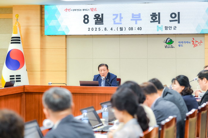 | ▲함안군은 4일 군청 중회의실에서 조근제 군수 주재로 8월 간부회의를 열고, 고향사랑기부제 참여 확대, 을지연습 철저 대비, 하계휴가철 공직기강 확립 등 주요 현안에 대해 논의했다. (사진=함안군) |