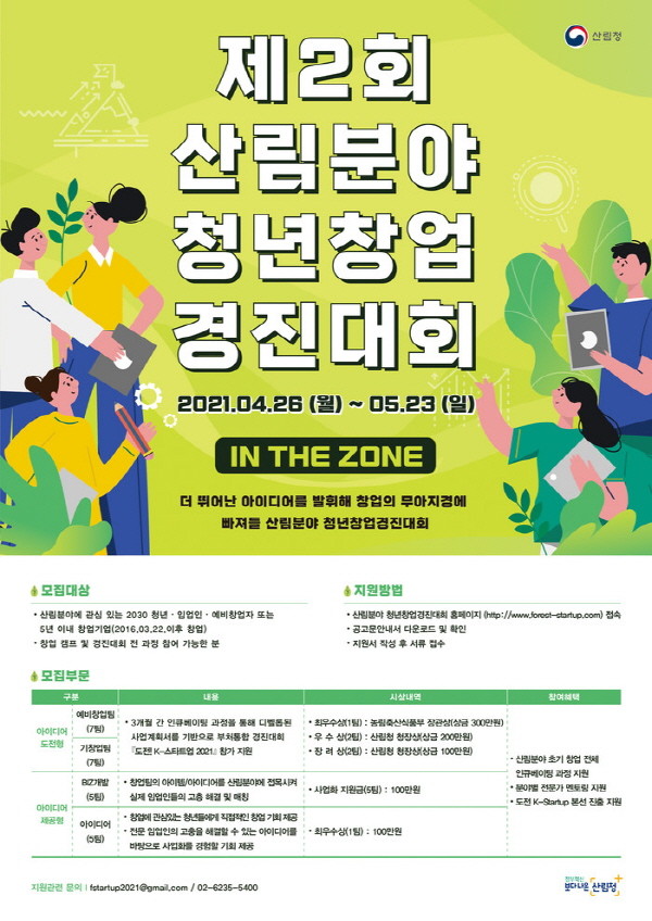 산림분야 창업에 관심 있는 2・30대 청년・임업인・예비창업자・5년 이내 창업기업(’16.3.22.이후 창업) 누구나 참가할 수 있으며, 경진대회 누리집에서 자세한 사항 확인 후 5월 23일까지 신청하면 된다.