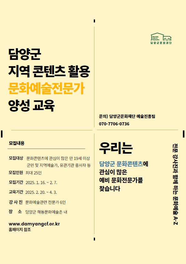 재단 문화예술 전문가 양성 과정은 담양군 지역 문화를 기반으로 문화예술전문가를 육성하기 위한 교육으로, 2월 20일부터 4월 3일까지 총 7회차 과정을 매주 목요일(1·2회차 목·금요일) 오후 5시에 진행한다.