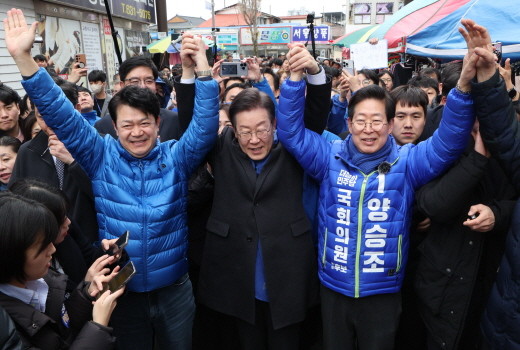 | ▲이재명 더불어민주당 대표가 11일 충남 홍성군 홍성시장을 방문해 복기왕 충남 아산시갑 국회의원 후보와 양승조 홍성·예산 국회의원 후보의 손을 들어 올리고 있다.(사진= 뉴스1) |