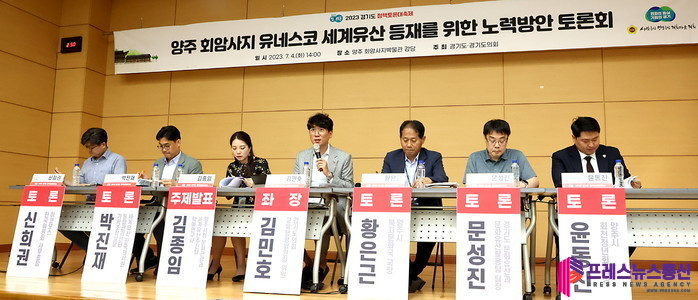 [프레스뉴스] 김대일 기자= 경기도의회 김민호 교육행정위원회 위원(국민의힘, 양주2)이 좌장을 맡은「양주 회암사지 유네스코 세계유산 등재를 위한 노력방안 토론회」가 7월 4일(화) 14시 양주 회암사지박물관 강당에서 개최됐다. 본 토론회는 경기도와 경기도의회가 공동으로 주최하는 ‘2023 경기도-경기도의회 정책토론 대축제’의 일환으로 개최되었다.
