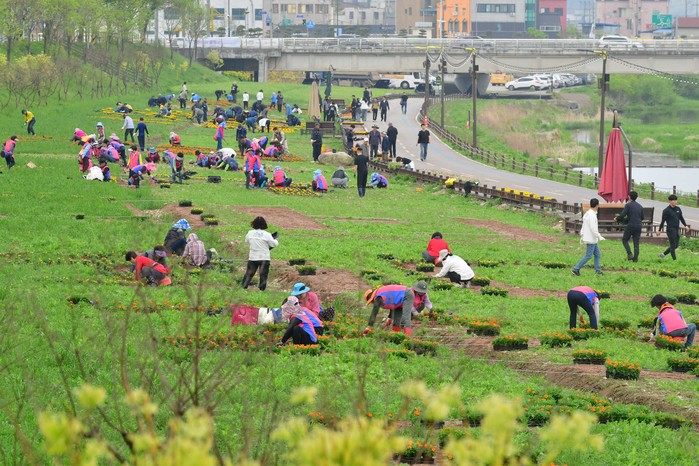 농촌지도자회, 생활개선회, 4-H(에이치)연합회, 귀농귀촌인협의회 4개 단체 회원 200여 명은 제2황룡교부터 문화대교까지 이어지는 17개 구간에 메리골드, 데이지 등 6만여 주를 식재했다.