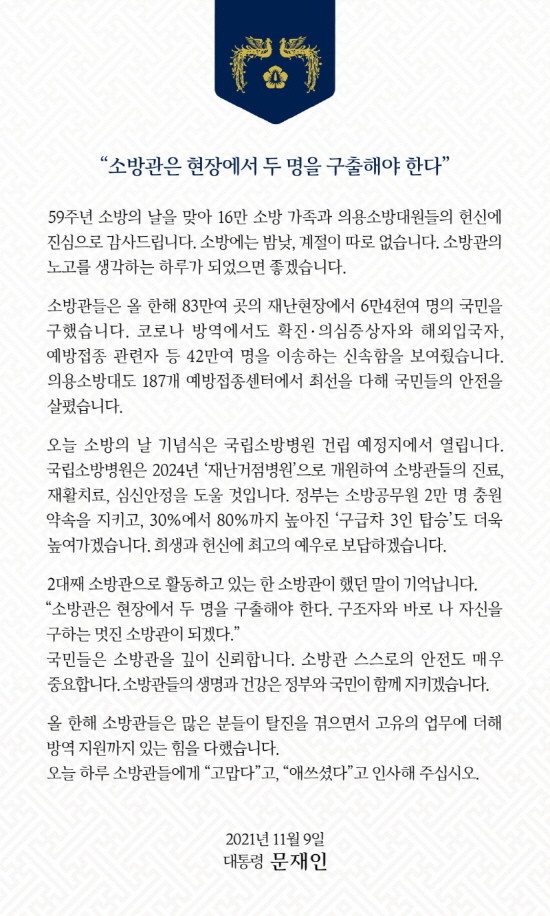 ▲ 문 대통령의 제59주년 소방의 날 기념 SNS 메시지. |