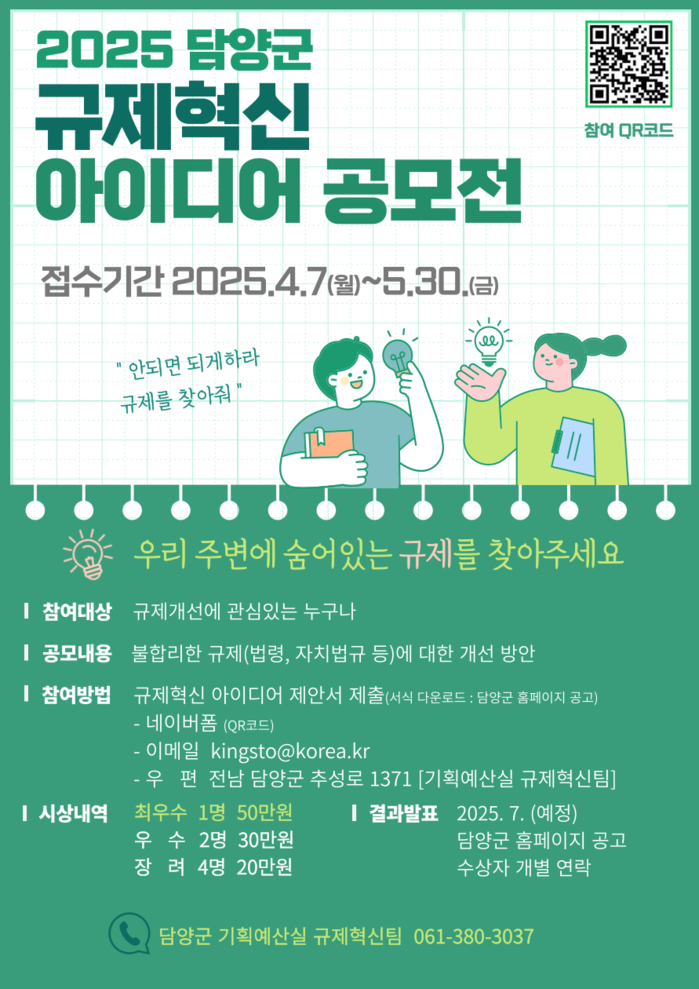 공모전에 대한 자세한 내용은 담양군청 기획예산실 규제혁신팀(☎ 061-380-3037)으로 문의하거나 군청 누리집 공고를 통해 확인할 수 있다.