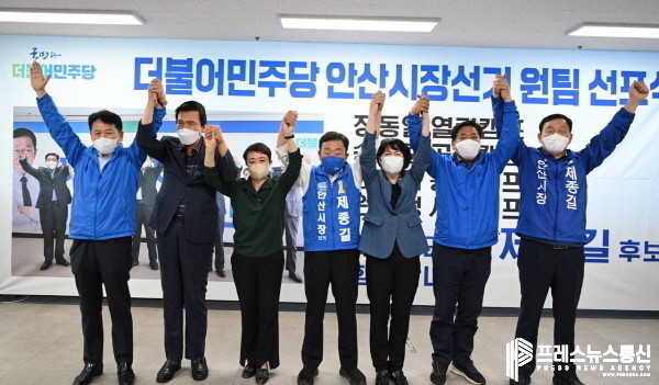 [프레스뉴스] 김대일 기자= 제종길 더불어민주당 안산시장 후보가 중반 지지세 결집을 위한 원팀 선포식을 24일 선거캠프에서 갖고 지방선거 총력전을 결의했다.