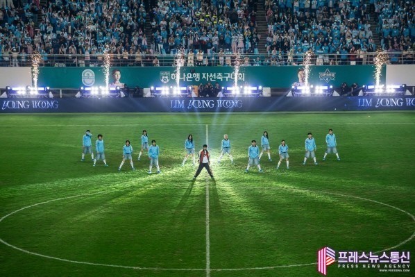 ▲『하나은행 자선축구대회』하프타임 중 펼쳐진 임영웅의 라이브공연 무대에 관중들이 환호하고 있다.(사진=하나은행) |