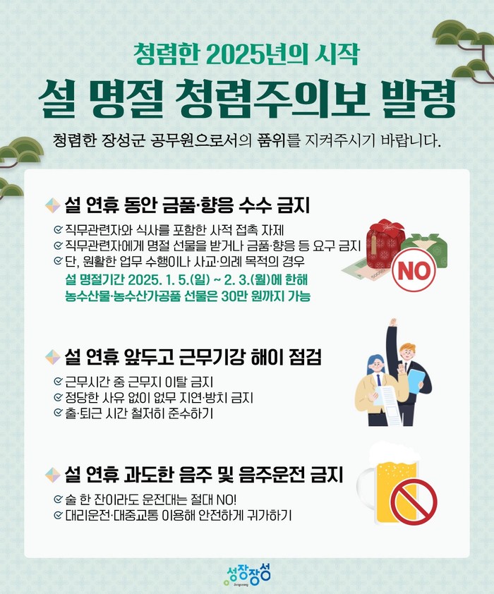 장성군은 청사 전광판 홍보와 함께 민원실 입구에 ‘설 명절 선물 안 주고 안 받기’문구가 적힌 입간판을 세운다. ‘청렴주의보’ 카드뉴스도 제작해 내부 게시판에 게재한다.