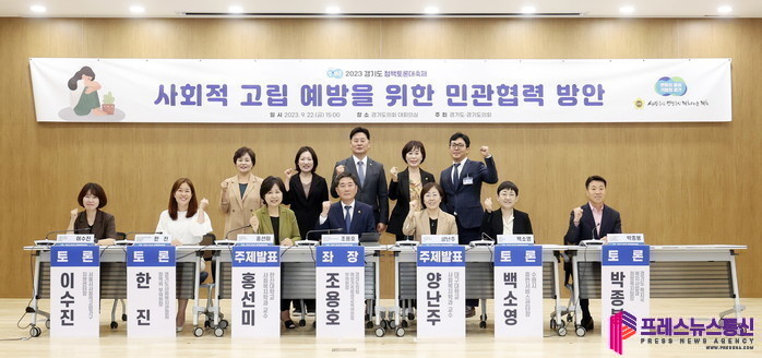 [프레스뉴스] 김대일 기자= 경기도의회 여성가족평생교육위원회 조용호 부위원장(더불어민주당, 오산2)이 좌장을 맡은 「사회적 고립 예방을 위한 민관협력 방안」토론회가 9월 22일(금) 경기도의회 대회의실에서 개최됐다. 본 토론회는 경기도와 경기도의회가 공동으로 주최하는 ‘2023 경기도-경기도의회 정책토론 대축제’의 일환으로 개최되었다.