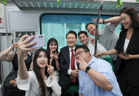 | ▲윤 대통령이 30일 대곡-소사 복선전철 개통 기념식에 앞서 경기도 부천 원종역에서 고양 대곡역을 향하는 전철에서 함께 시승한 주민들과 기념촬영하고 있다.(사진= 대통령실) |