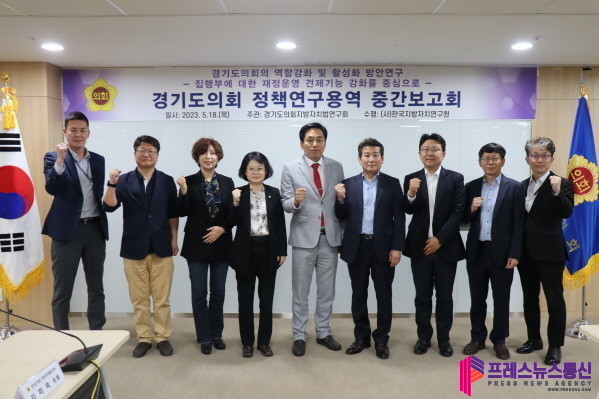 [프레스뉴스] 김대일 기자= 경기도의회 의원연구단체인 ‘경기도의회 지방자치법연구회(회장 이은주)’는 18일(목) 경기도의회 중회의실1에서 ‘경기도의회의 역할강화 및 활성화 방안 연구(집행부에 대한 재정운영 견제기능 강화를 중심으로)’ 용역 중간보고회를 개최하였다.