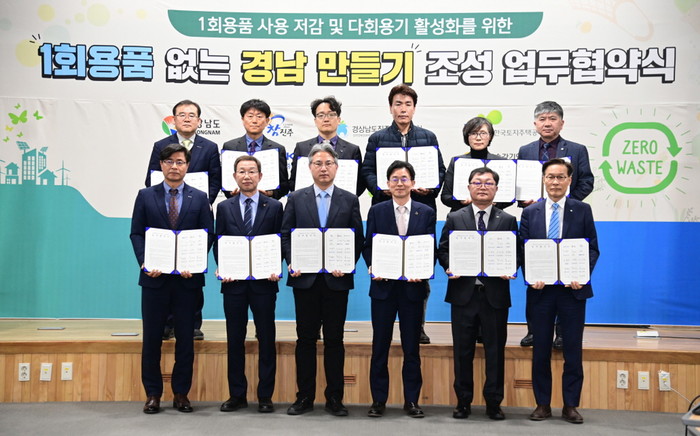 경상남도, 진주시, 한국토지주택공사, 한국남동발전, 중소벤처기업진흥공단, 국토안전기술원, 한국승강기안전공단, 한국세라믹기술원, 한국산업기술시험원, 주택관리공단, 진주교육지원청, 경남광역자활센터 등 총 12개 공공기관은 20일 경상남도 서부청사에서 ‘1회용품 없는 경남 만들기’ 협약을 체결했다.