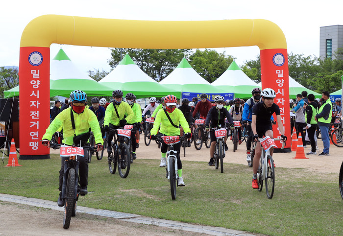▲15일 예림초등학교에서 개최된 밀양시 생활체육 시민자전거 타기 대회 참가자들이 출발하는 모습(사진=밀양시) |