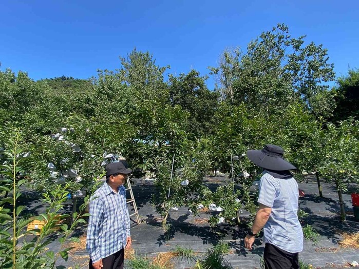 | ▲농업기술센터 과수 담당자가 도곡면 대곡리 과수 농가에 폭염 대응 관리 지도하는 장면(사진제공=화순군) |