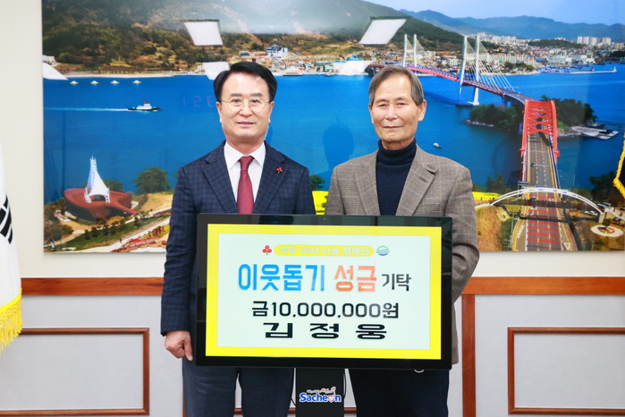 ▲김정웅 영채장학회 대표가 시청을 방문해 관내 저소득 가정을 위해 사용해 달라며 성금 1000만 원을 기탁했다. (사진=사천시) |