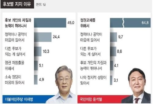 반면 이재명 후보를 지지하는 유권자들의 45.0%는 ‘후보 개인의 자질과 능력이 뛰어나서’라고 답했습니다.