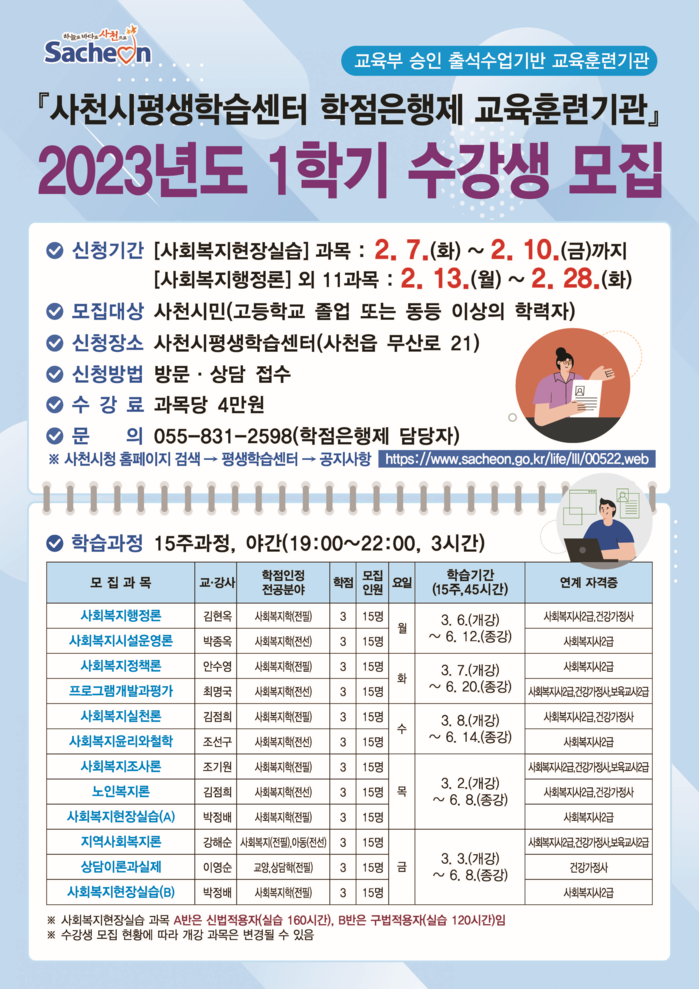 ▲ 사천시평생학습센터 학점은행제 교육훈련기관 ‘2023년도 1학기 평가인정 학습과정’ 수강생 모집 홍보물(사천시 제공) |