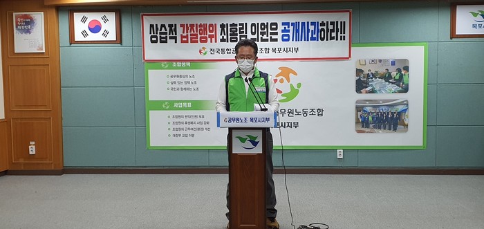 [전남=프레스뉴스] 강래성 기자=전국통합공무원노동조합 목포시지부(위원장 김정진)가 11일 목포시의회 최홍림 의원의 갑질에 대한 공개사과와 재발방지 약속 등을 촉구하는 성명서를 발표했다.