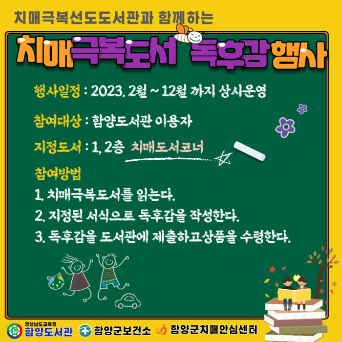 치매에 관한 궁금한 점 또는 치매극복도서독후감행사 관련 문의사항은 함양군보건소 치매안심센터 전화 또는 방문하면 된다.