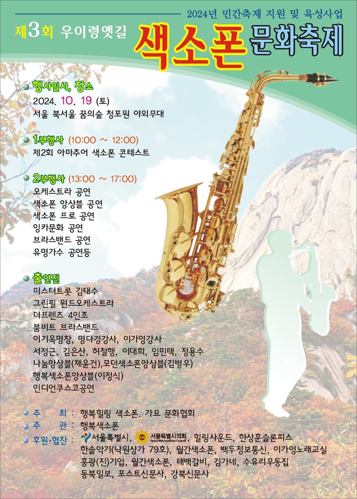 행복힐링색소폰 가요문화협회(최태홍 회장)가 주최하고 행복색소폰 주관으로 다음 달 19일 주말에 서울 북서울 꿈의숲 청포원 야외무대에서 열린다.