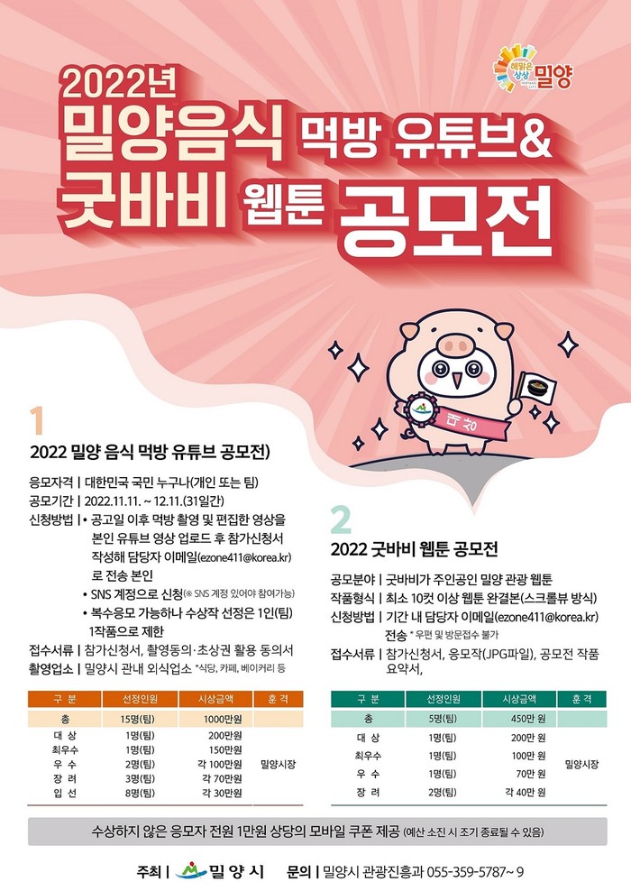 이번 공모전은 먹방 유튜버 참여를 유도해 밀양 먹거리, 외식업소 홍보 및 매출을 증대하고, 테마가 있는 밀양 관광 웹툰으로 최신 여행 트렌드를 반영한 관광 홍보를 위해 개최된다.