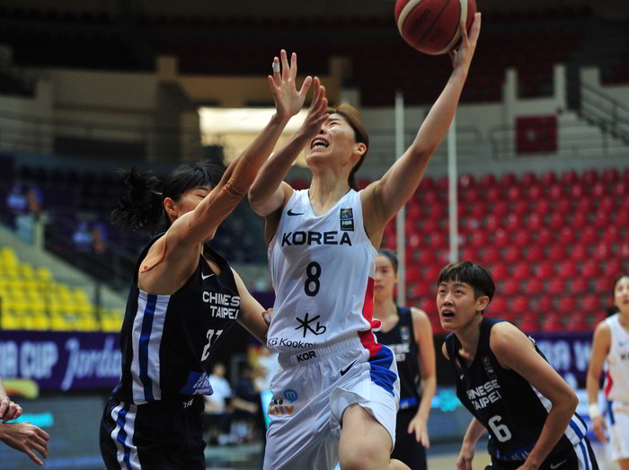 [프레스뉴스] 채정병 특파원=30일(현지시간) 요르단 암만에서 열리고 있는 국제농구연맹(FIBA) 아시아컵 여자농구 4강 진출 결정전에서 우리나라가 대만을 80대74로 꺾으며 4강에 진출한 가운데 김민정이 수비를 뚫고 슛하고 있다.