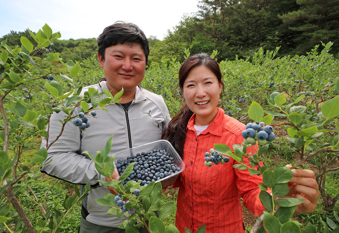 | ▲ 산청군 단성면 유병부 정진주 부부 농가에서 블루베리 수확을 하고 있다.(사진=산청군) |