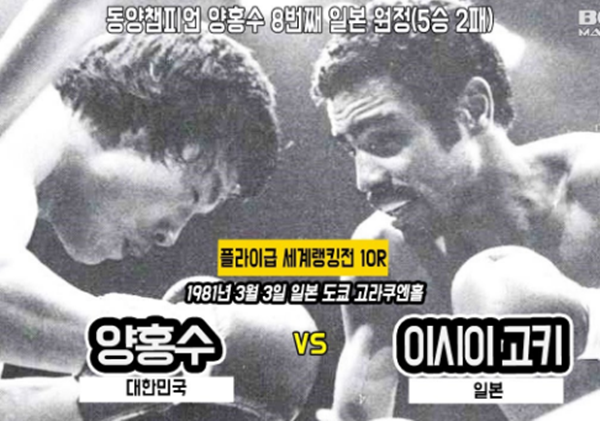 왼손잡이면서 격렬한 타격전을 펼쳤던 파이터 양홍수는 김태식·박찬희가 출연(出演)하기 전 김학영(동신체)과 함께 플라이급의 대표적인 복서였다. 챔피언에 오른 양홍수는 논타이틀전에서 이가라시를 8회 KO로 물리치지만 정작 일본 동경에서 벌어진 1차방어전에선 홈 텃세에 밀려 2ㅡ0 판정패를 당한다. 1979년 8월 아오모리에서 3번째 만난 양홍수는 군말 없는 판정으로 이가라시를 잡으면서 투타임 동양 플라이급 챔피언에 등극한다.