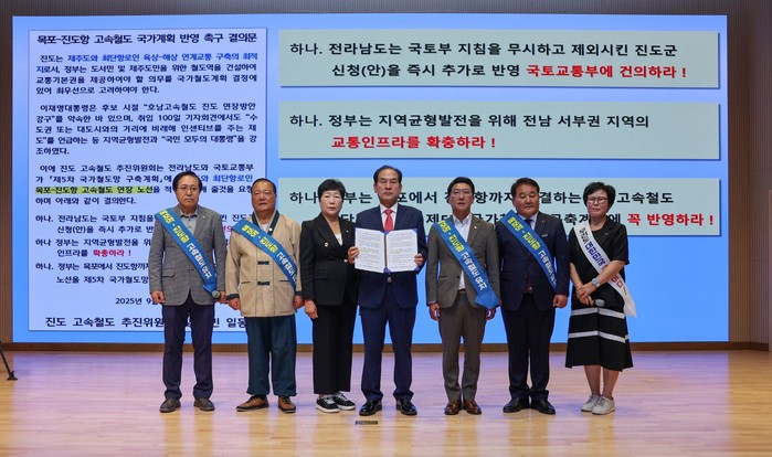 박종온 공동추진위원장은 “국토교통부가 제5차 국가철도망 구축계획을 수립하는 과정에서 모든 지방자치단체에 건의 기회를 부여했음에도 불구하고 진도군의 건의서는 전달되지 않은 현실이 매우 안타깝다”라며, “진도군의 생존과 미래를 위해 이재명 대통령의 지역 공약사항인 ‘호남고속철도 진도군 연장 방안’이 반드시 이행될 수 있도록 군민 모두가 뜻을 모아야 한다”라고 강조했다.
