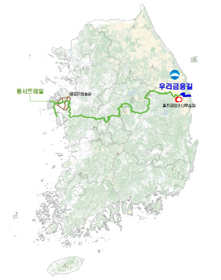 우리금융은 동서트레일의 시작점인 울진군 하원리~망양정 구간(20km) 조성에 참여했다. 이 구간은 지난해 역대 최장기 산불인 울진·삼척 산불로 인해 막대한 피해를 입었지만, 민관이 힘을 합쳐 소나무숲을 지켜낸 것으로 유명한 지역이기도 하다.